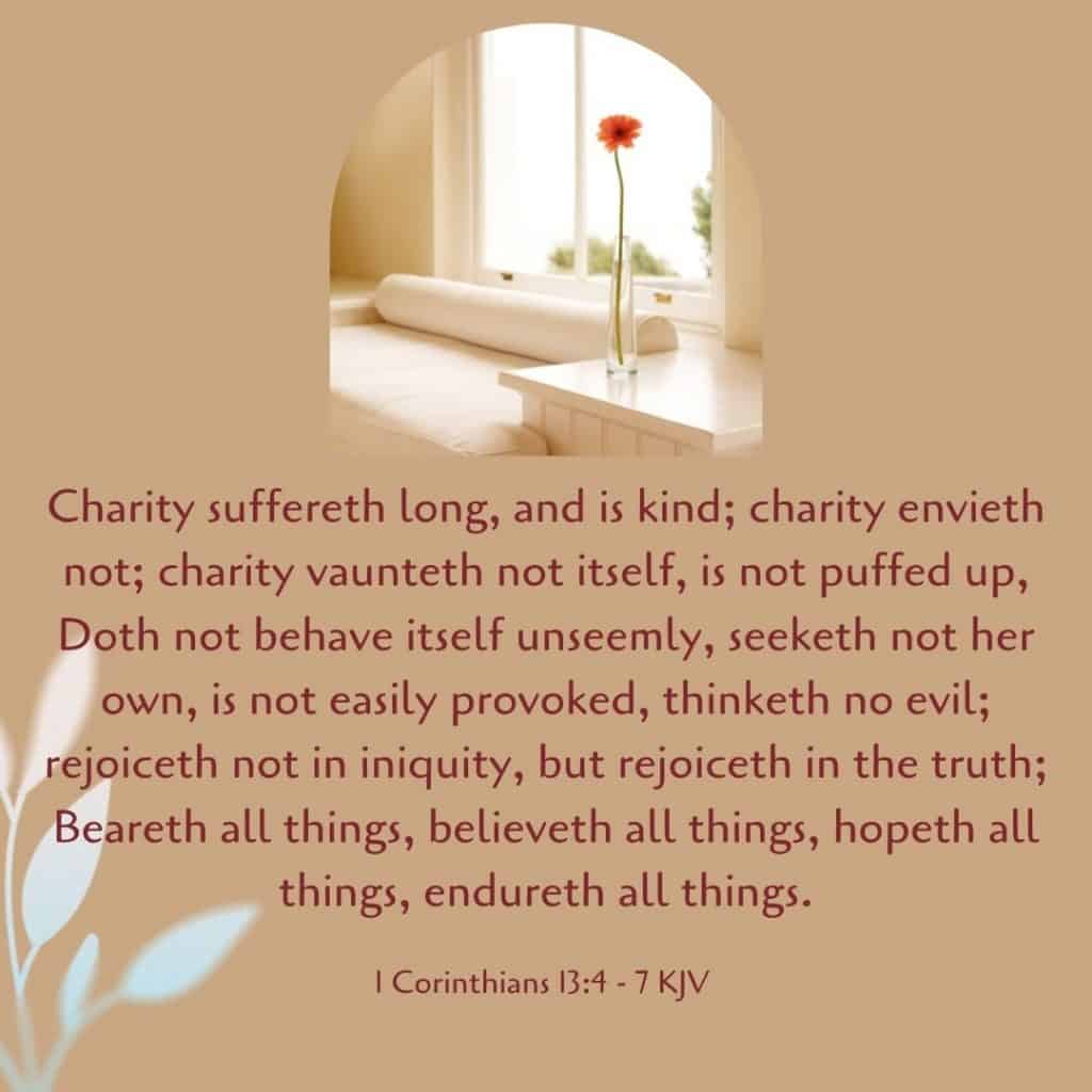 1 Corinthians 13:4 – 7 KJV Charity suffereth long, and is kind; charity envieth not; charity vaunteth not itself, is not puffed up, Doth not behave itself unseemly, seeketh not her own, is not easily provoked, thinketh no evil; rejoiceth not in iniquity, but rejoiceth in the truth; Beareth all things, believeth all things, hopeth all things, endureth all things.