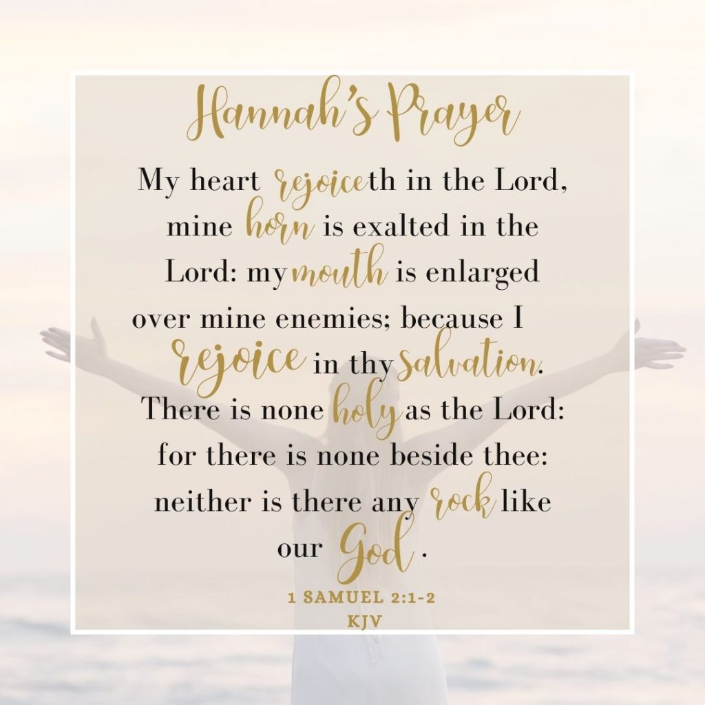 1 Samuel 2:1–2 – And Hannah prayed, and said, My heart rejoiceth in the Lord, mine horn is exalted in the Lord: my mouth is enlarged over mine enemies; because I rejoice in thy salvation. There is none holy as the Lord: for there is none beside thee: neither is there any rock like our God.