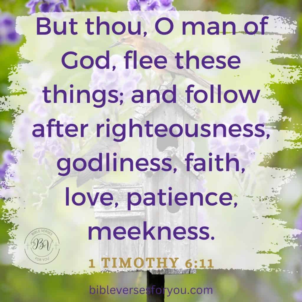 12. But thou, O man of God, flee these things; and follow after righteousness, godliness, faith, love, patience, meekness. – 1 Timothy 6:11