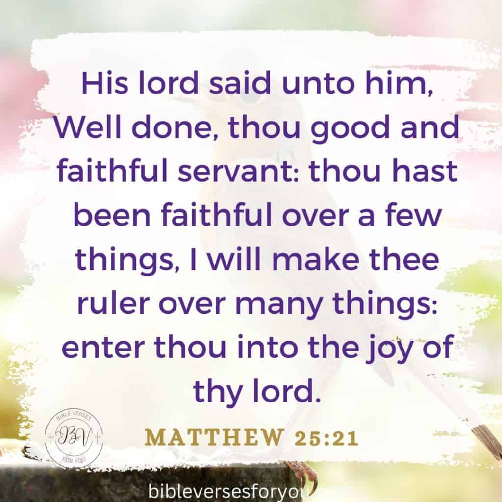 2. His lord said unto him, Well done, thou good and faithful servant: thou hast been faithful over a few things, I will make thee ruler over many things: enter thou into the joy of thy lord. Matthew 25:21