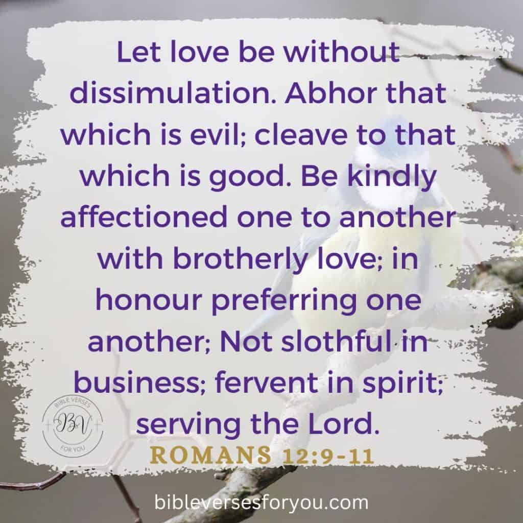 11. Let love be without dissimulation. Abhor that which is evil; cleave to that which is good. Be kindly affectioned one to another with brotherly love; in honour preferring one another; Not slothful in business; fervent in spirit; serving the Lord. – Romans 12:9-11