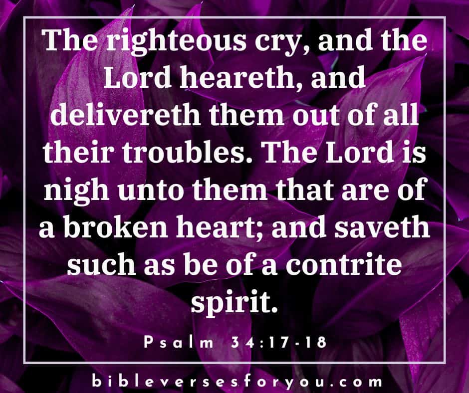 Psalm 34:17-18 The righteous cry, and the Lord heareth, and delivereth them out of all their troubles. The Lord is nigh unto them that are of a broken heart; and saveth such as be of a contrite spirit.