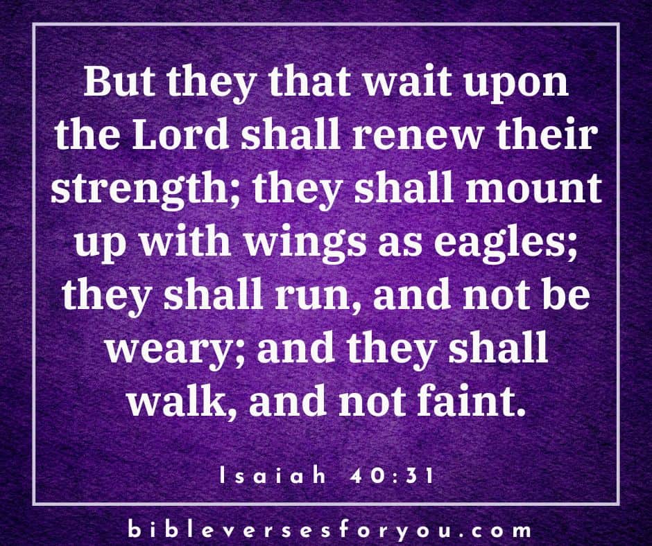 Isaiah 40:31 But they that wait upon the Lord shall renew their strength; they shall mount up with wings as eagles; they shall run, and not be weary; and they shall walk, and not faint.