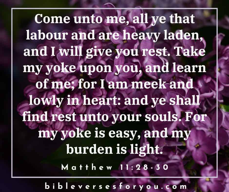 Matthew 11:28-30 Come unto me, all ye that labour and are heavy laden, and I will give you rest. Take my yoke upon you, and learn of me; for I am meek and lowly in heart: and ye shall find rest unto your souls. For my yoke is easy, and my burden is light.
