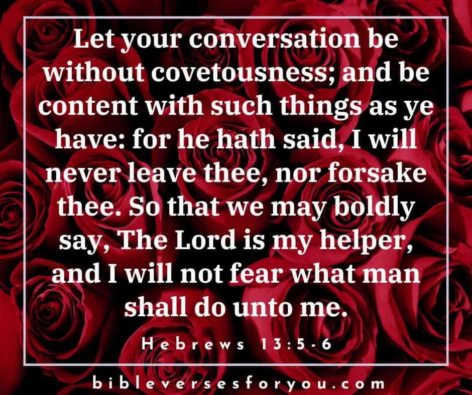 Hebrews 13:5-6 Let your conversation be without covetousness; and be content with such things as ye have: for he hath said, I will never leave thee, nor forsake thee. So that we may boldly say, The Lord is my helper, and I will not fear what man shall do unto me.