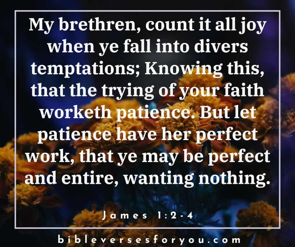 James 1:2-4 My brethren, count it all joy when ye fall into divers temptations; Knowing this, that the trying of your faith worketh patience. But let patience have her perfect work, that ye may be perfect and entire, wanting nothing.