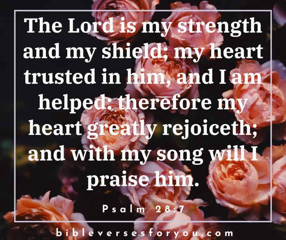Psalm 28:7 The Lord is my strength and my shield; my heart trusted in him, and I am helped: therefore my heart greatly rejoiceth; and with my song will I praise him.