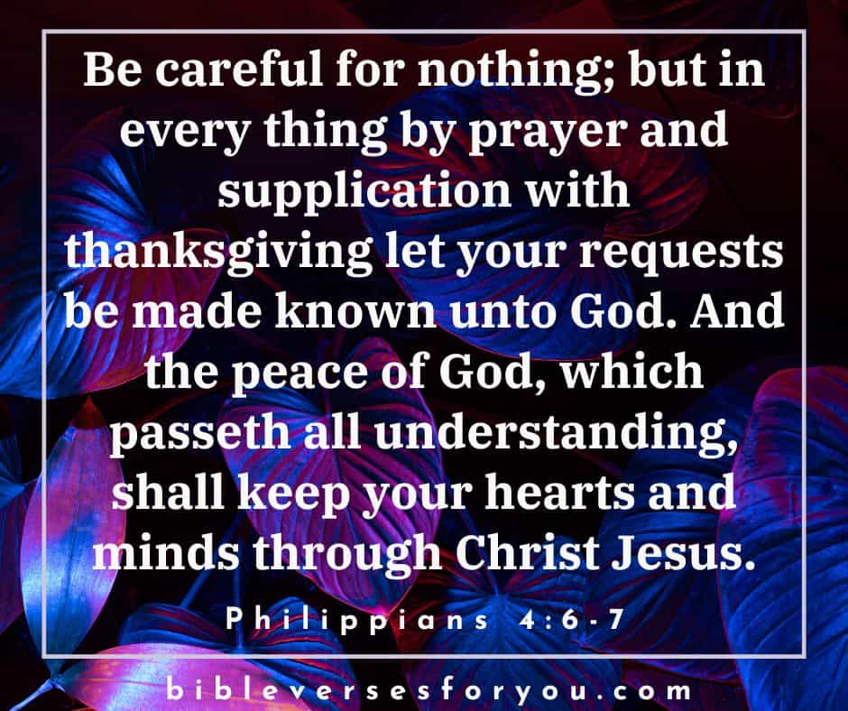 Philippians 4:6-7 Be careful for nothing; but in every thing by prayer and supplication with thanksgiving let your requests be made known unto God. And the peace of God, which passeth all understanding, shall keep your hearts and minds through Christ Jesus.